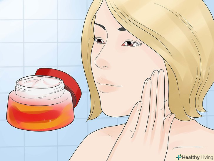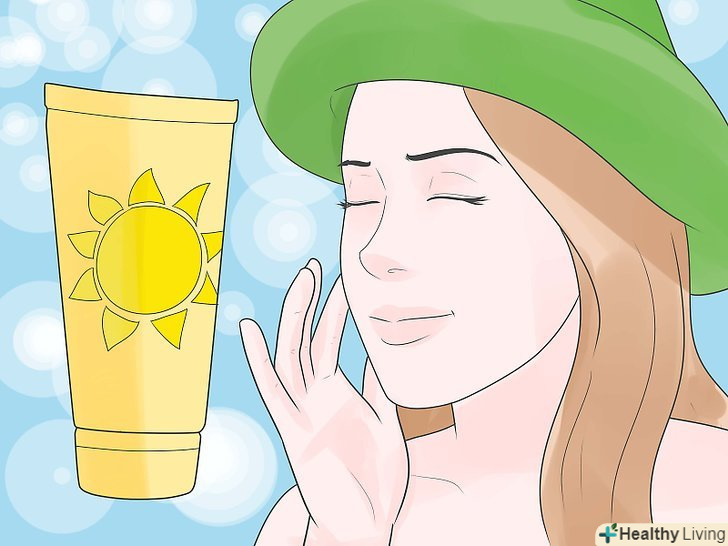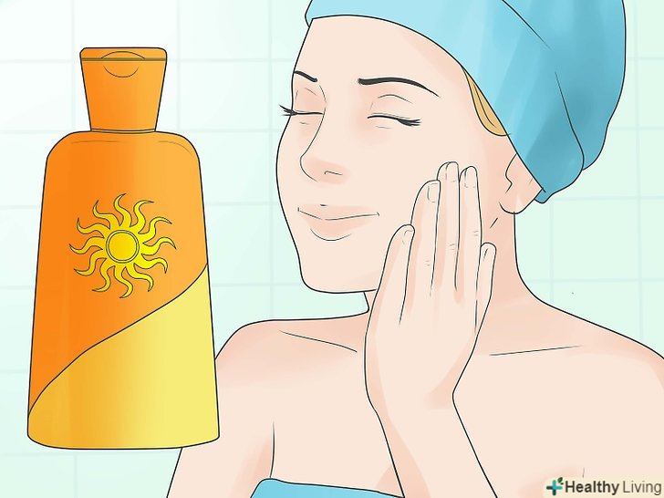 Щодня наносите сонцезахисний крем.застосовуйте сонцезахисний крем з SPF 30 або 50, коли виходите на вулицю, щоб захистити обличчя та інші відкриті ділянки шкіри. Нанесіть сонцезахисний крем як мінімум за 15 хвилин до виходу на вулицю, і через кожні 90 хвилин після. Якщо ви будете плавати або потіти, використовуйте водостійкий сонцезахисний крем.[25]