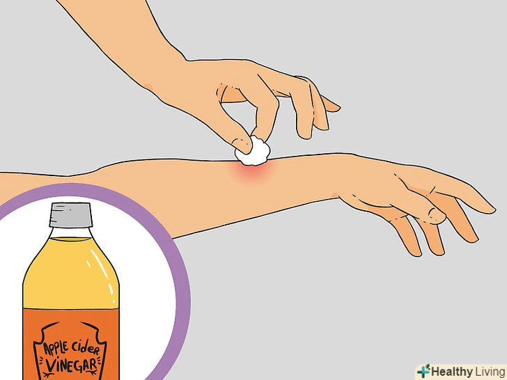 Змочіть місце укусу яблучним оцтом.намочіть ватяну кульку яблучним оцтом і прикладіть його до місця укусу. У перші секунди ви можете відчути печіння, але потім біль вщухне.[10]