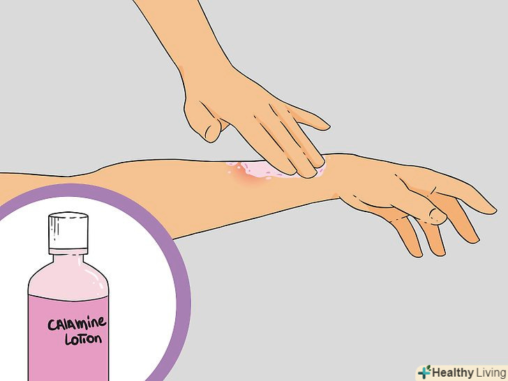 Змочіть місце укусу каламіновим лосьйоном.цей лосьйон допомагає як при укусах бджіл, так і при подразненні після дотику до отруйного плюща. Змочіть лосьйоном ватяну кульку і нанесіть його на місце укусу. Використовуйте лосьйон відповідно до вказівок щодо застосування.[13] особливо ефективним може виявитися каламіновий лосьйон з болезаспокійливу дію (наприклад, Каладрил).- При необхідності нанесіть лосьйон ще раз через чотири години.
