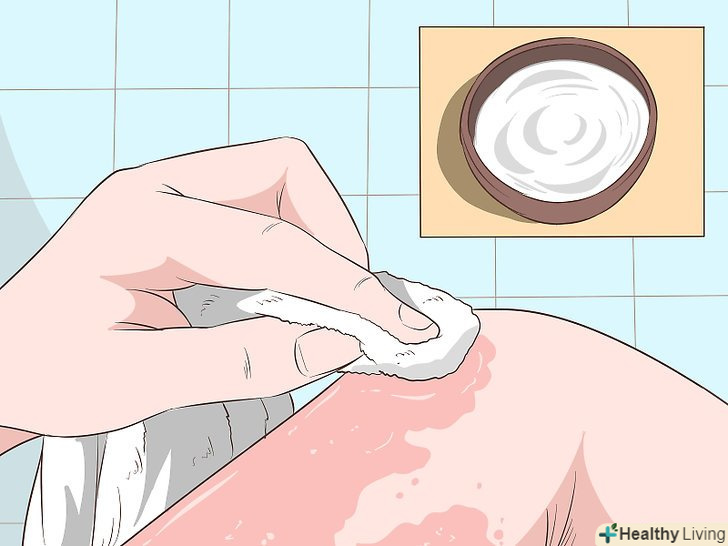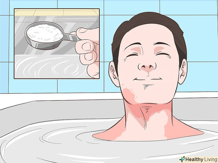Розчиніть один стакан харчової соди у ванні з прохолодною водою.пориньте у ванну і полежте трохи, а після того, як ви вийдете з неї, дайте розчину соди висохнути на шкірі. Сода надасть заспокійливий ефект і допоможе шкірі швидше відновитися.[11]- Харчова сода має антисептичні та протизапальні властивості. Це означає, що вона допоможе зменшити запалення і запобіжить розвитку інфекцій.[12].
