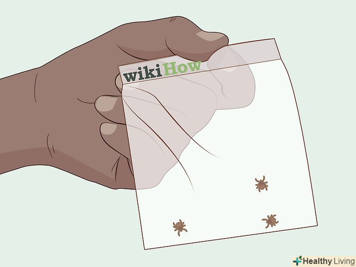 Помістіть кліща в закриту ємність, якщо хочете перевірити його на хвороби.для цього використовуйте банку, пакет із застібкою або будь-яку іншу ємність з кришкою. Якщо протягом двох тижнів після укусу у вас виникнуть небажані симптоми, віднесіть банку лікаря. Лікар відправить кліща на аналіз. [9]- Якщо ви хочете залишити кліща для аналізу, не тисніть його, не спалюйте і не топіть в спирті. Просто помістіть в ємність і тримайте кліща там, поки його не перевірять.
