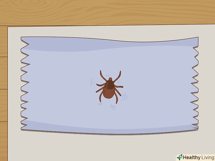 Приклейте кліща, якщо хочете визначити його вигляд.Приклейте кліща до шматка паперу міцною прозорою клейкою стрічкою, наприклад, скотчем. Так він нікуди не втече, поки ви не дізнаєтеся, що це за різновид. Деякі види кліщів можуть переносити лише певні захворювання. Якщо ви захворієте, то ця інформація допоможе лікарю поставити діагноз.[10]- Віднесіть кліща лікаря або дізнайтеся про різні види в Інтернеті і визначте його самі.