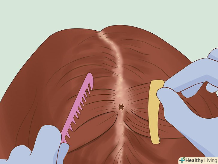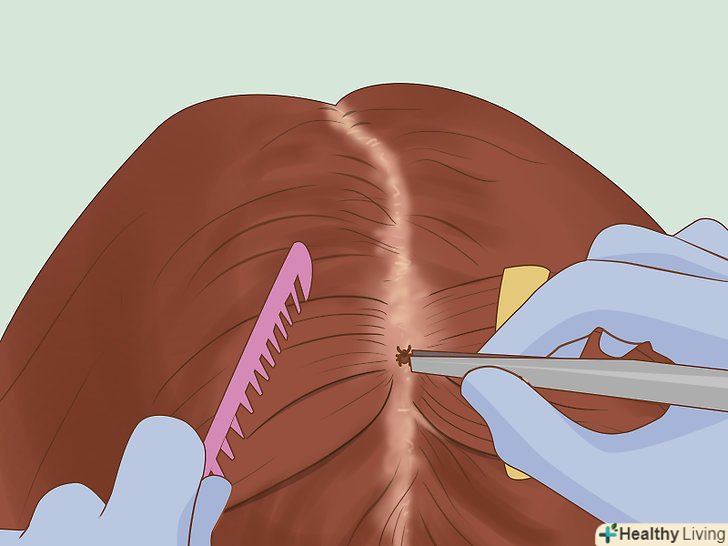 Попросіть когось оглянути вашу голову.для цього людина повинна надіти рукавички. Попросіть його повністю оглянути волосся і шкіру голови. Кліщі досить малі, тому потрібно шукати крихітні коричневі або чорні цятки на шкірі.[1]- Якщо людина помітить кліщів, нехай прибере їх пальцями (попередньо надівши рукавички), серветкою або пінцетом.