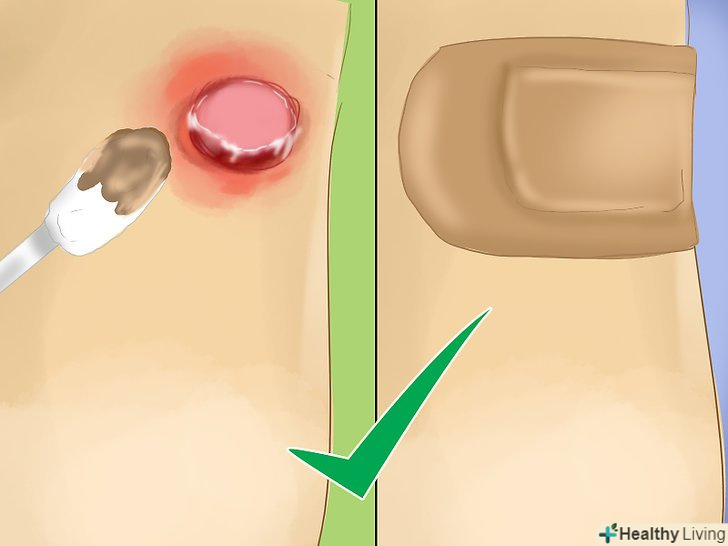 Змінюйте лейкопластир щодня.обережно знімайте лейкопластир, накладайте новий шар мазі і знову заклеюйте пухир. Через кілька днів шкіра під ним заживе, і ви зможете акуратно зрізати клапоть мертвої шкіри, яка прикриває рану. Це можна зробити ножицями, простерилізованими спиртом. Кожен раз при зміні лейкопластиру оглядайте рану на наявність ознак інфекції. Зверніться до лікаря, якщо ви помітили такі ознаки:[6][7]- З часом посилилося почервоніння, набряк, біль, ділянка стала гарячою.