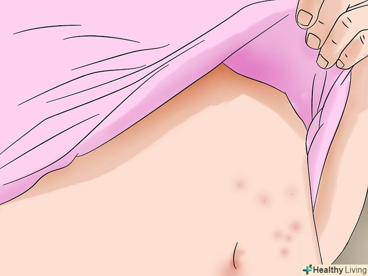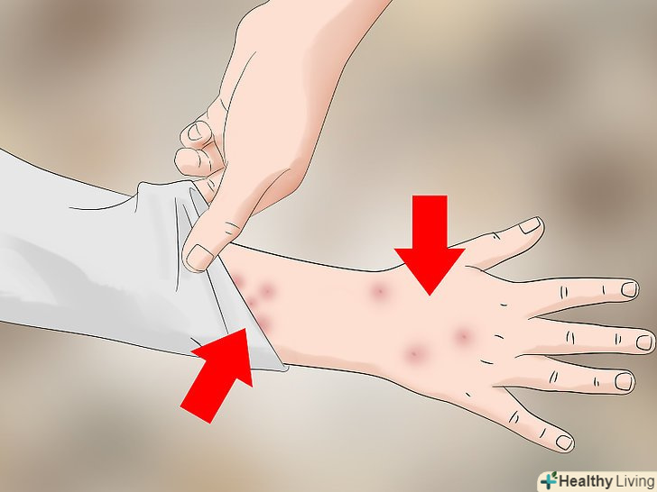 Пошукайте нові укуси вранці.якщо, прокинувшись, ви виявите нові укуси або сверблячі прищі, то вас, швидше за все, покусали постільні клопи. Чи схожі ці укуси на укуси комарів або бліх? Укуси постільних клопів виглядають як червоні і злегка припухлі ділянки шкіри, сверблячі так само, як і укуси інших комах. Знайдіть укуси, розташовані в лінію або групу відокремлених укусів. Подібне розташування обумовлено тим, що постільні клопи за ніч можуть вкусити вас по кілька разів.[3]- Якщо нові укуси з'явилися протягом дня, то вас, швидше за все, вкусила інша комаха.