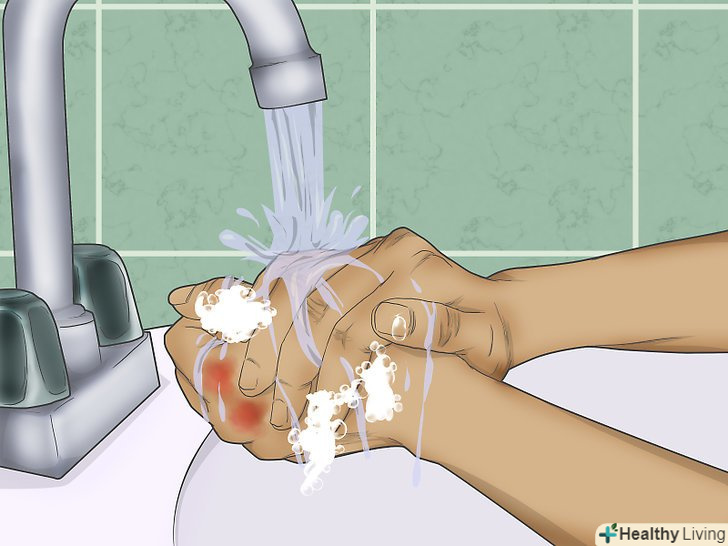 Промийте опік водою.вимийте руки м'яким милом, а потім промийте опік прохолодною водою. Не наносьте мило безпосередньо на опік. Насухо промокніть опік м'яким рушником (ні в якому разі не тріть).[5]- Будьте обережні-під час промивання від місця опіку може відокремитися частина м'яких тканин.