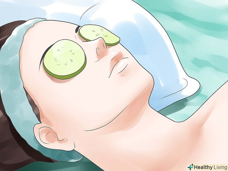Заспокойте очі чимось прохолодним.набряклість під очима, як і будь-яка припухлість, проходить після додатка холодного компресу. Огірки мають підходящої формою, текстурою і розміром для лікування набряків під очима, тому наріжте огірок і не забудьте його попередньо охолодити в холодильнику. Прикладіть часточки на 15 хвилин на закриті очі або до тих пір, поки огірки не стануть теплими.- Якщо у вас немає огірка, то змочіть кілька пакетиків чаю і охолодіть їх в морозильній камері протягом 15 хвилин перед тим, як прикласти до очей.