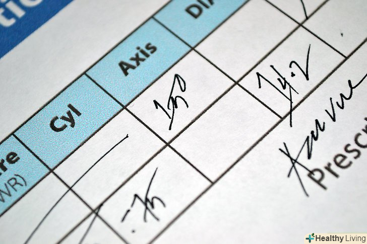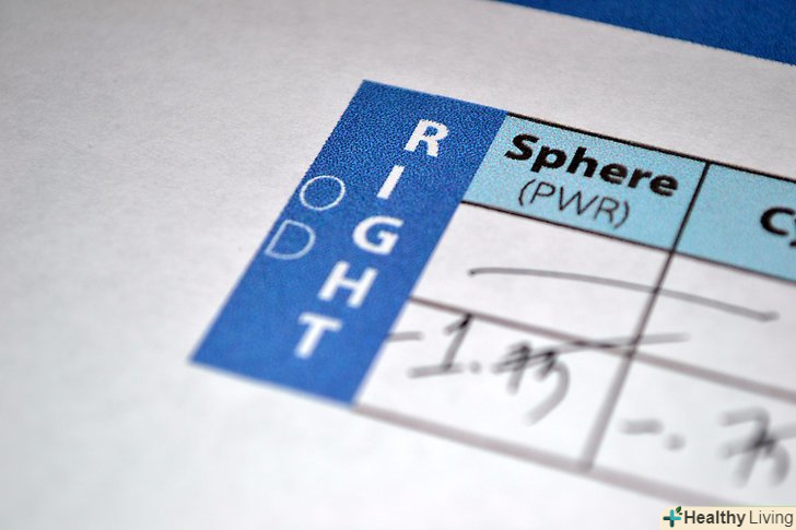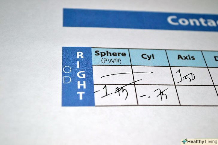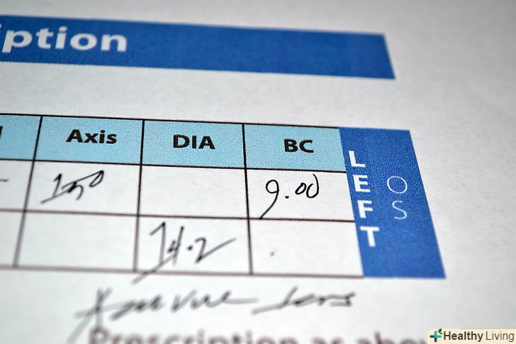 Знайдіть таблицю або схему у ваших паперах з коригування зору; таблиця або схема – це стандартна форма для рецепта на контактні лінзи, розташування стовпчиків графіка можуть варіюватися в залежності від побажання лікаря.- Переконайтеся, що ви дивитеся на рецепт для контактних лінз, а не для окулярів, вони можуть містити однакові абревіатури, але цифри можуть відрізнятися.