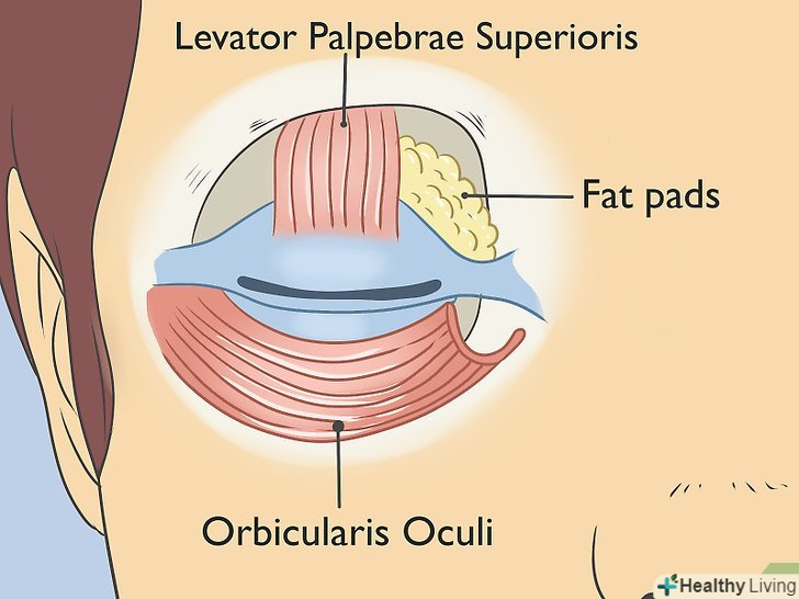 Розберіться, як влаштовані повіки.за допомогою м'язів повіки відкриваються і закриваються. Також в століттях є жировий прошарок, яка з віком збільшується. Через птоз насамперед страждають такі частини століття:[11]- Круговий м'яз ока. Цей м'яз оточує око. Вона відповідає за різні мімічні вирази і з'єднується з іншими м'язами.