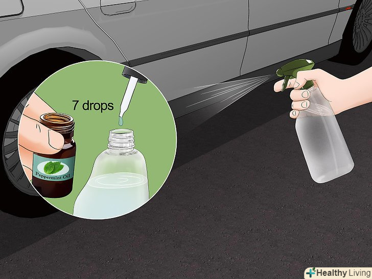 Приготуйте спрей з ефірною олією, щоб відлякати павуків природним способом.завдяки своєму сильному запаху і смаку, деякі ефірні масла здатні відлякувати павуків та інших комах. Візьміть пляшку з розпилювачем і змішайте в ній 5-7 крапель ефірного масла з 2 склянками (480 мл) води, після чого обприскати цю суміш по периметру авто. Наступні ефірні олії особливо ефективні проти павуків:[5]- Цитрусове;