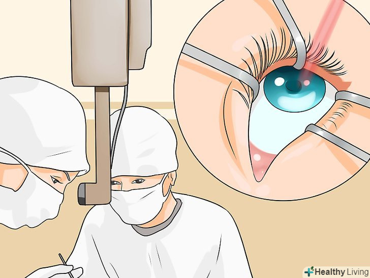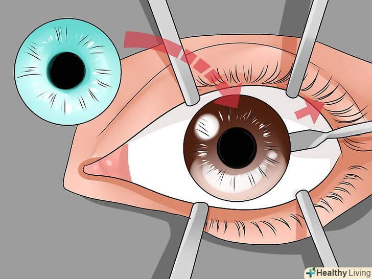 Пройдіть спеціальну хірургічну процедуру лазером.хоча цей метод не апробований медичними установами в Росії, проте, існує хірургічна процедура, яка здійснюється лазером, і на постійній основі змінює колір ваших очей на блакитний. Суть методу полягає у використанні лазера для того, щоб випалити меланін у верхньому шарі райдужки, відкривши її блакитну підкладку. Оскільки ця процедура є досить новим методом, немає ні краплі інформації про те, які її довгострокові наслідки для здоров'я. Так чи інакше, застосування лазера щодо ваших очей є небезпечним при будь – яких умовах-по можливості, вам варто уникати його.[3]- Оскільки не існує довгострокових досліджень, не можна напевно знати, чи не повернеться меланін знову.