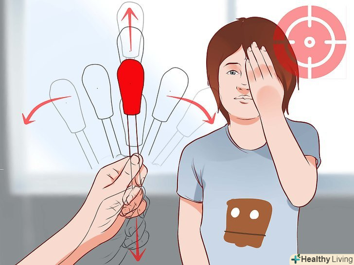 Виконайте тест з рухомим предметом.перевірте, як дитина реагує на рух, щоб порівняти швидкість реакції обох очей. Візьміть ручку з яскравим ковпачком або інший яскраво забарвлений предмет. Попросіть дитину сфокусувати погляд на певній частині предмета (наприклад, на ковпачку ручки або на кульці льодяника на паличці).[16]- Попросіть дитину не відривати погляд від певної частини предмета.