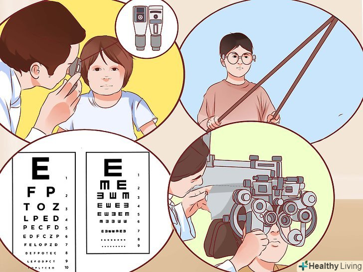 Ознайомтеся з деякими методами та інструментами.Офтальмолог перевірить зір вашої дитини і огляне його очі, щоб виявити можливу амбліопію.[24] розуміння використовуваних лікарем методів дозволить вам відчувати себе більш комфортно, і ви зможете заспокоїти дитину під час огляду.[25]- Ретиноскопия. Лікар може оглянути очі за допомогою ручного інструменту, так званого ретиноскопа. Ретиноскоп висвітлює внутрішню поверхню ока. Він дозволяє лікарю визначити можливі порушення заломлення світла (такі як короткозорість, далекозорість і астигматизм) по "червоному рефлексу" з очного дна. Крім іншого, даний метод корисний для виявлення пухлин і катаракти у немовлят. При цьому лікар, швидше за все, використовує розширюють зіницю краплі.[26]