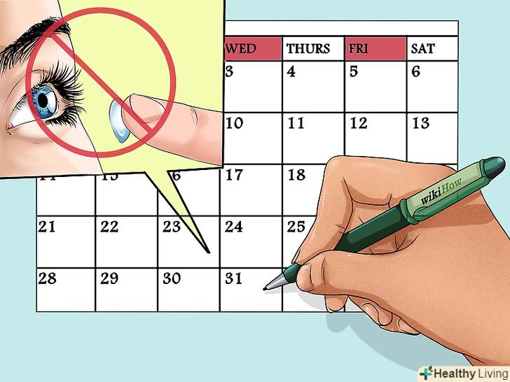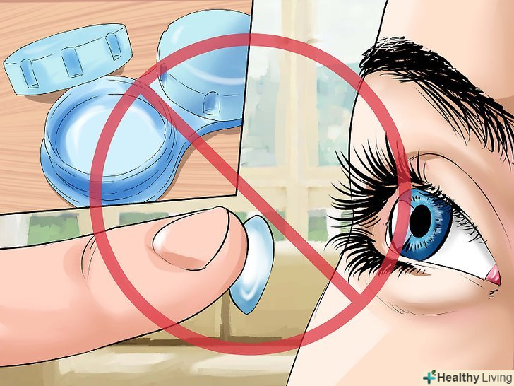 Не носіть контактні лінзи.уникайте носіння контактних лінз до того моменту, поки цього не дозволить вам офтальмолог. Якщо ви постійно носите лінзи, то після отримання травми рекомендується не користуватися ними, як мінімум, протягом тижня, поки рогівка не відновиться повністю.[19]- Це особливо важливо, якщо подряпина рогівки головним чином була викликана носінням контактних лінз.