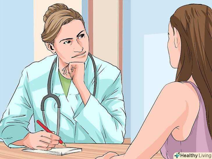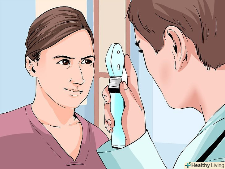 Отримайте офіційний діагноз від лікаря.якщо ви підозрюєте у себе травму рогівки, то краще призначити візит до окуліста.[8] окуліст огляне ваше око за допомогою офтальмоскопа. Крім того, під час огляду лікар може скористатися спеціальним барвником флуоресцеїном, який забарвить слізну рідину в жовтий колір. Барвник зробить вашу травму більш помітною в променях світла.[9]- Під час даної процедури попередньо застосовується зовнішнє знеболюючий засіб для очей, а потім обережно відтягується нижню повіку. До ока прикладається смужка з флуоресцеїном, і при Вашому моргання фарба поширюється по поверхні ока. Пожовклі вже при нормальному освітленні ділянки ока відразу вказують на травмовані місця рогівки. Далі лікар за допомогою кобальтової синьої лампи підсвітить пошкодження і постарається виявити його причину.[10]