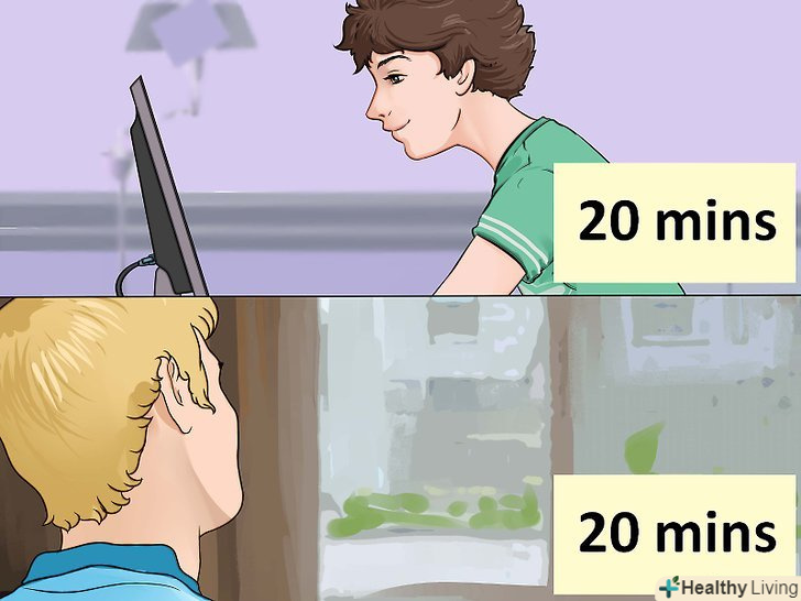 Перерви при роботі на комп'ютері.сьогодні багато людей проводять весь свій робочий день за комп'ютером. Якщо у вас та ж ситуація, то необхідно проявити свідомість в догляді за очима. Напруга очей, яке проявляється у формі розмитого зору і неможливості зосередитися, є частою проблемою офісних працівників.- Робіть перерви для очей кожні 20 хвилин і протягом 20 секунд дивіться на предмет, який віддалений від вас приблизно на 5 метрів. Кожні дві години відволікайтеся від екрану комп'ютера на 15 хвилин. Такий відпочинок надзвичайно корисний.[4]