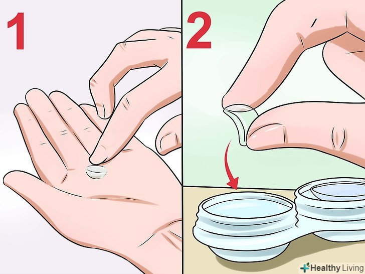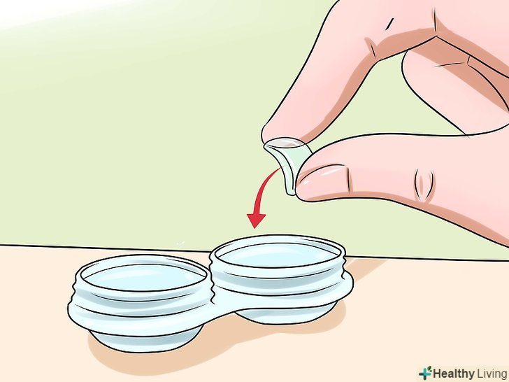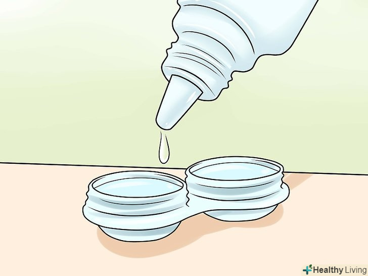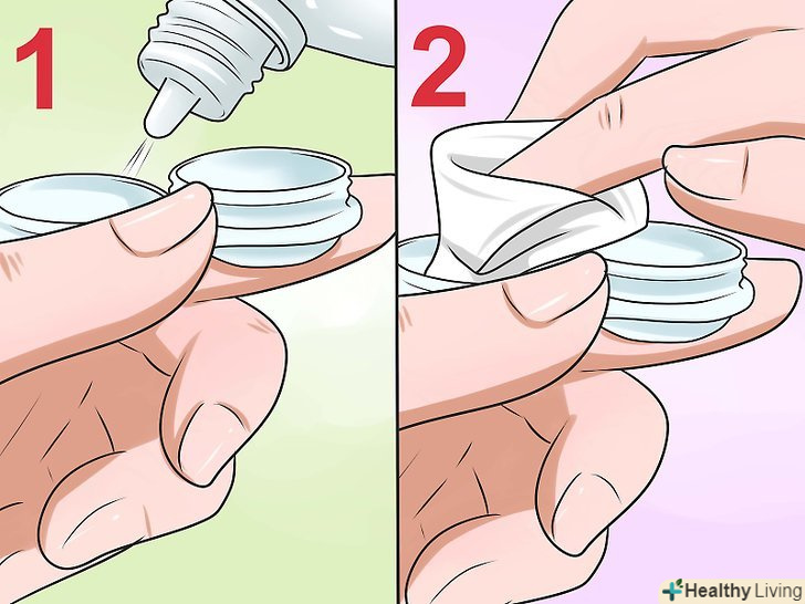 Очистіть контейнер для лінз перед використанням.футляр для зберігання необхідно чистити кожен день перед тим, як прибрати в нього контактні лінзи. Вимийте контейнер стерильним розчином або гарячою водою і дайте йому висохнути.[12]
