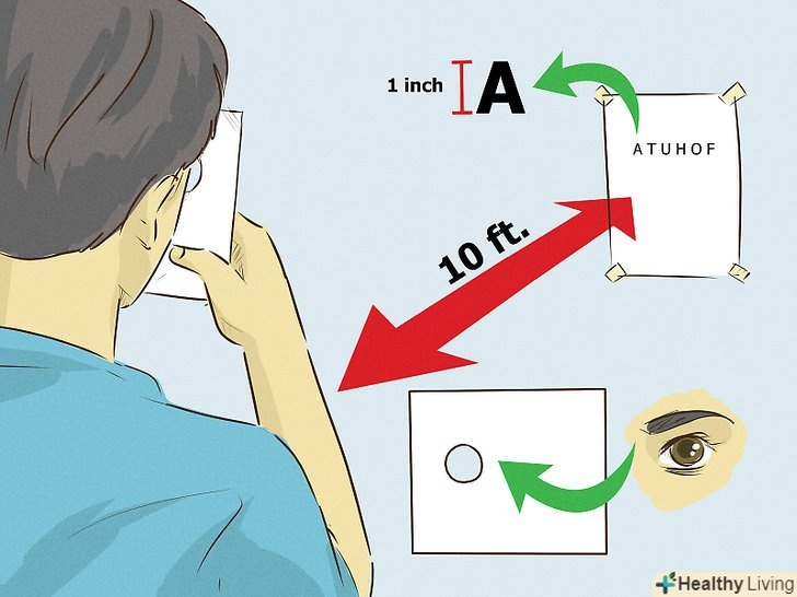 Проведіть тест по віддаленій картці з отвором.даний тест перевірить, яким оком Ви користуєтеся, щоб сфокусуватися на об'єктах, які віддалені від вас на 3 м.перевірку можна спокійно провести самостійно прямо у себе вдома.[2]- Виріжте на аркуші паперу отвір діаметром близько 4 см. на другому аркуші паперу напишіть одну букву висотою приблизно 2,5 см.