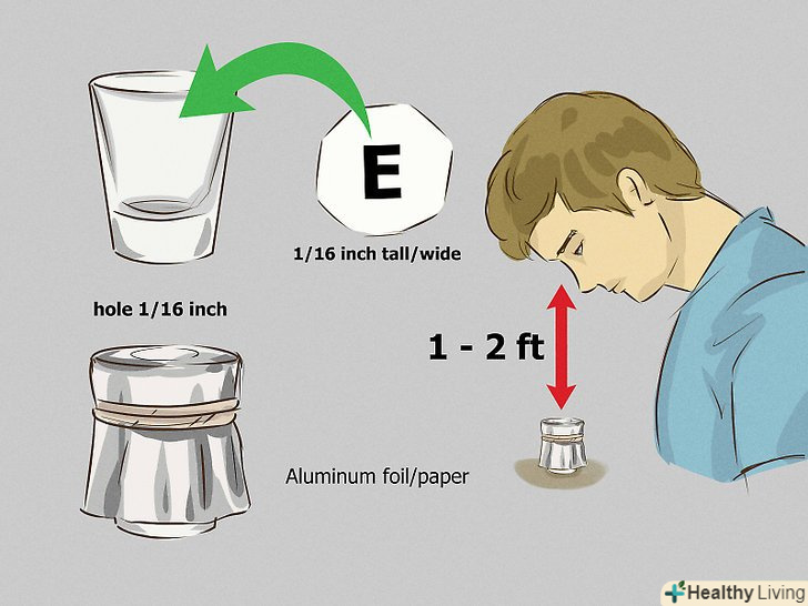 - Поставте наперсток або чарку на стіл і схиліться над ним, щоб вам було видно букву. Не торкайтеся до наперстка / чарці і не притискайтеся оком до отвору. Голова повинна знаходитися на відстані 30-60 см від нього.