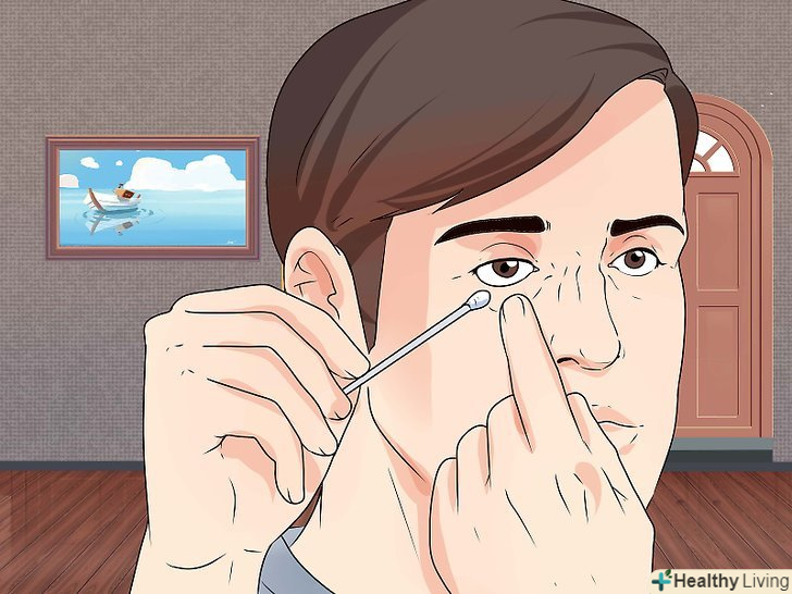 Видаліть смітинку ватною паличкою.якщо попередній метод не дав результатів, спробуйте видалити смітинку ватною паличкою. Спочатку повторно знайдіть місце розташування смітинки на склері (білої частини очного яблука), потім змочіть ватяну паличку водою, притримайте очей у відкритому стані і обережно вийміть смітинку з ока кінчиком ватної палички.- Якщо у вас немає під рукою ватних паличок, то також можна взяти чисту ганчірочку або м'який вологий рушник. якщо смітинка розташовується на рогівці (а не на білій частині очного яблука), не намагайтеся видалити її ватною паличкою. Рогівка є дуже чутливою частиною ока, і ви можете її травмувати.[6][7]