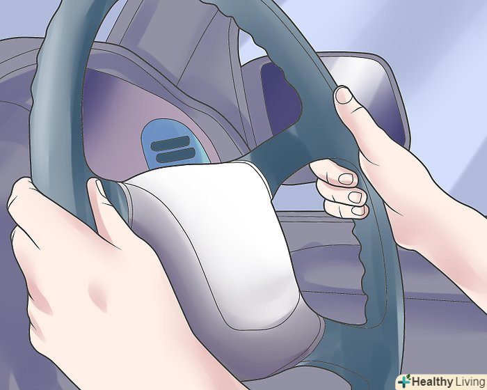 Тримайте обидві руки на рульовому колесі.у такому випадку у вас буде більше контролю над машиною в аварійній ситуації. Уявіть, що одна рука ліниво спочиває на кермі, коли потрібно зробити різкий поворот — так ви втрачаєте дорогоцінні частки секунд на необхідність перегрупуватися і ризикуєте власною безпекою.- Тримайте руки на кермі в положенні 10 і 14 годин. Можливо, це не найзручніше положення, але так ви отримаєте максимальну гнучкість при раптовій необхідності змінити траєкторію руху.[2]