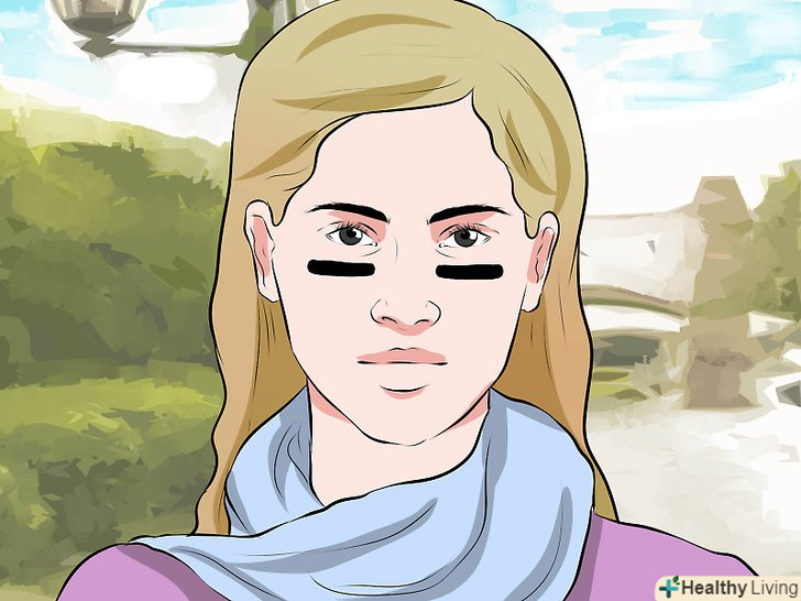 Використовуйте "чорне око".багато спортсменів при грі під відкритим небом або при яскравому штучному освітленні використовують так званий "чорне око" (чорні смуги під очима), що дозволяє зменшити світлові відблиски. Наклейте під очима чорні смужки або нанесіть їх легко змивається чорним жиром, щоб менше мружитися від сонячних відблисків. Будьте обережні з жиром і стежте, щоб він не потрапив на одяг або меблі, звідки він погано видаляється.[2]- Спортсмени нерідко використовують "чорне око", так що подивіться спортивні репортажі або фотографії, щоб дізнатися, як саме його слід наносити.
