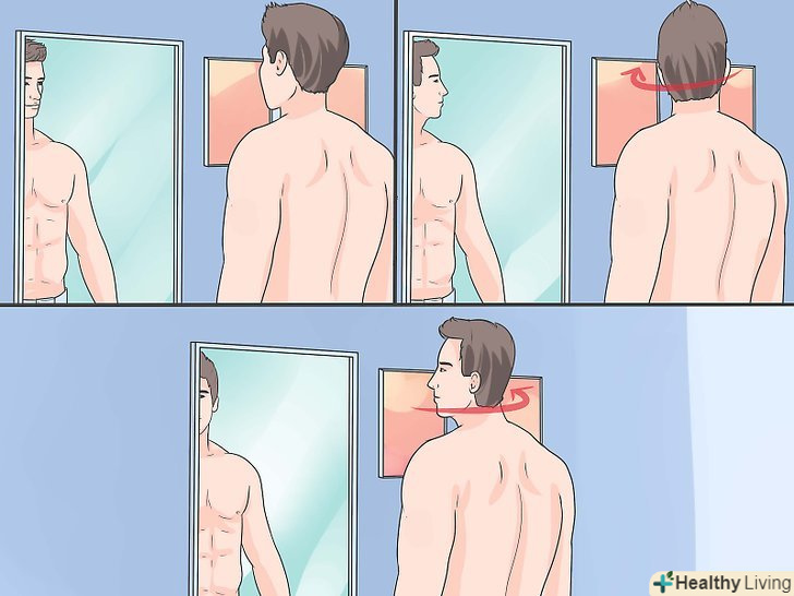 Якщо чужорідне тіло не видно відразу, поворухніть оком.Поводите оком вгору і вниз, а також з боку в бік і спробуйте розгледіти потрапив в нього об'єкт. При цьому вам може бути непросто стежити за своїм оком, тому після кожного руху дивіться в дзеркало, чи не став видно сторонній об'єкт.[5]- Поверніть головою і понаклоняйте її вліво, вправо, вперед і назад, продовжуючи при цьому дивитися в дзеркало на око.