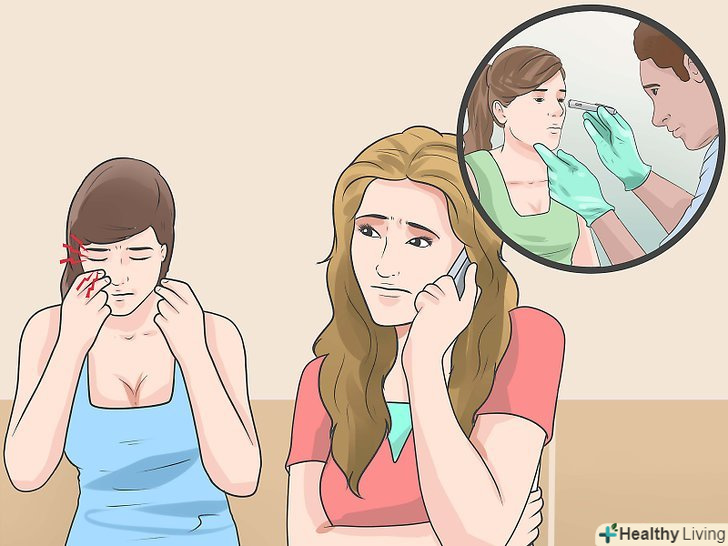 Зателефонуйте в службу невідкладної медичної допомоги і проконсультуйтеся щодо подальших дій.після того, як ви промиєте очі, зателефонуйте 103 (Швидка медична допомога) або 112 (єдиний номер екстрених служб). При можливості попросіть зателефонувати когось іншого, поки ви промиваєте очі. Постарайтеся якомога швидше отримати медичну допомогу.[17]- Якщо вам в очі потрапило небезпечне хімічна речовина, слід негайно звернутися за медичною допомогою (навіть в тому випадку, якщо ви промили очі).
