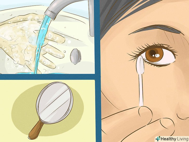 Візуально знайдіть вію в оці.даний метод вимагає, щоб ви спочатку вимили руки і знайшли те місце в оці, куди потрапила Вія.- Подивіться в дзеркало і знайдіть вію. Видаляти вію ватяними паличками або пальцями можна тільки в тому випадку, якщо вона знаходиться на білій частині очного яблука, а не в зоні райдужки. Рогівка в зоні райдужки більш чутлива, тому якщо Вія застрягла десь в цій області, краще звернутися за допомогою до офтальмолога.[3]