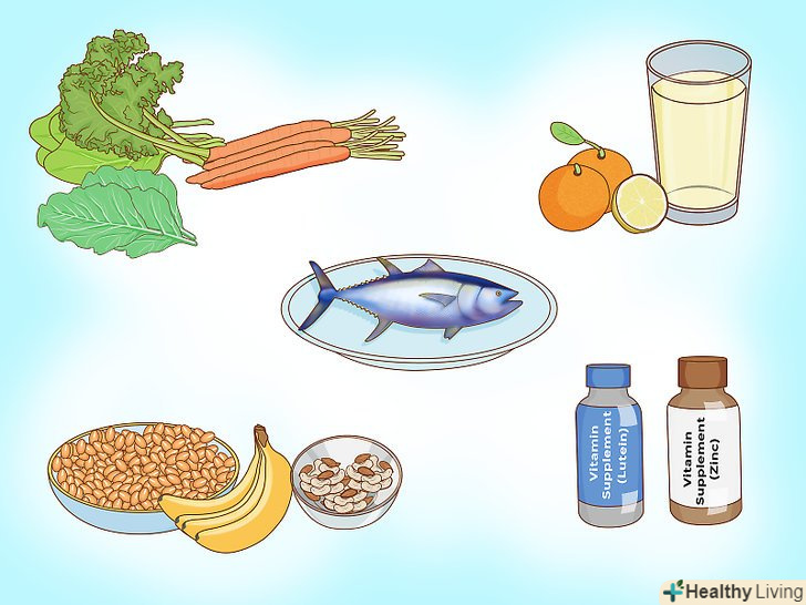 Вживайте їжу, яка корисна для здоров'я очей.хоча зір навряд чи вдасться поліпшити за рахунок одного раціону харчування, Ви забезпечите свої очі всіма необхідними їм поживними речовинами. Постарайтеся включити в свій раціон наступні продукти:[3]- Зелені листові овочі (Городня капуста, листовий буряк, листова капуста, шпинат), а також морква.