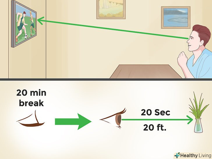 Знизьте навантаження на очі.як і будь-які інші м'язи, очні м'язи втомлюються і болять, якщо їх занадто перевантажувати. Щоб ваші очі не втомлювалися, спробуйте наступне:- Дотримуйтеся принципу "20-20-20". Якщо ви довго працюєте за комп'ютером, через кожні 20 хвилин робіть перерви. При цьому відводите погляд від монітора і фокусуйте його на чому-небудь на відстані 6 метрів (20 футів) протягом хоча б 20 секунд.