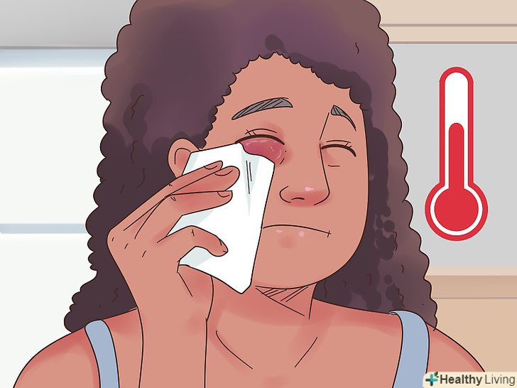 Через пару діб почніть прикладати вологі компреси. [8] після одного або двох днів використання льоду для зняття набряку слід змінити підхід і почати прикладати до пошкодженої ділянки теплий компрес.- Прикладіть до пошкодженої ділянки теплу і вологу серветку або компрес. Не використовуйте грілку, оскільки вона виробляє сухе тепло і може занадто сильно нагріватися, що викличе лише погіршення стану чутливої шкіри навколо очей.