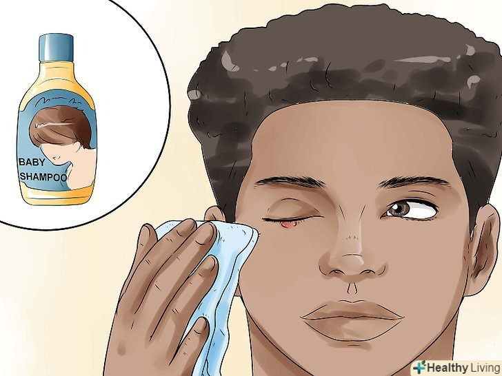 Очистіть ячмінь.ячмінь зазвичай виникає абсолютно випадково, а іноді через попадання в око чужорідної субстанції (наприклад, пилу або косметики). Сам по собі ячмінь є невеликою бактеріальною інфекцією.[2] якщо у вас утворився ячмінь, то перше, що ви повинні зробити, це промити заражену ділянку.[3]- Ретельно вимийте руки, а теплою водою очистіть ячмінь чистими руками або за допомогою ватної палички. Ви також можете скористатися спеціальним скрабом для століття або розведеним дитячим шампунем.[4]
