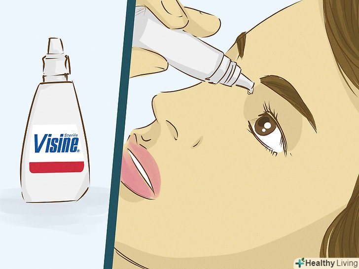 Використовуйте очні краплі, що звужують кровоносні судини.очні краплі на зразок Візіна звужують кровоносні судини в очах і знімають почервоніння. Деякі препарати містять компонент для зволоження очей.[3]- Очні краплі подібного типу можуть викликати повторне почервоніння. Після припинення дії препарату кровоносні судини можуть розширитися більше звичайного, що лише посилить почервоніння.