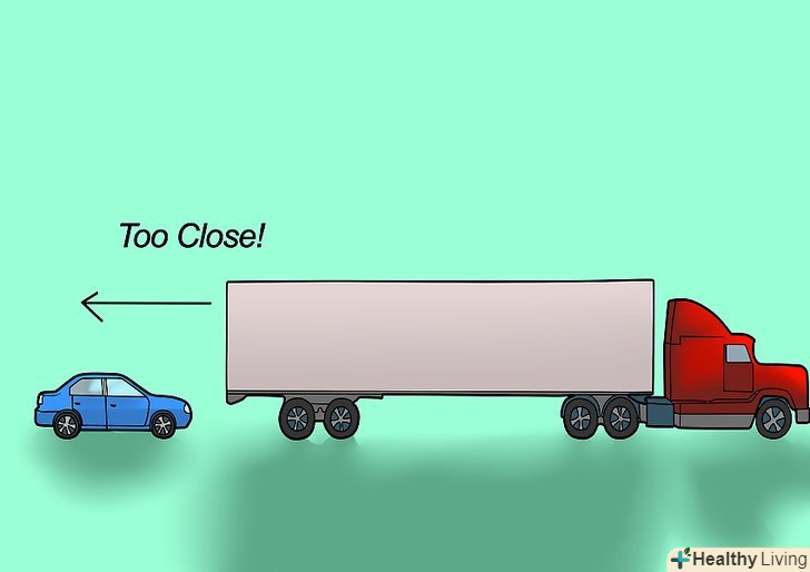 Не наближайтеся до вантажівки занадто близько.наблизившись до нього впритул (або, як кажуть, "сидячи у нього на хвості"), ви потрапите в його мертву зону, і якщо водій вас не помітить, то при здійсненні вантажівкою маневру або несподіваному гальмуванні, ви ризикуєте в нього врізатися. Найбільш безпечним відстанню до вантажівки вважається дистанція, еквівалентна 20-25 довжинам автомобілів.[4] таку відстань ще називають дистанцією чотирьох секунд.[5] при несприятливих погодних умовах дистанція повинна бути ще більше.[6]- Сидіти у Вантажівки" на хвості " небезпечно ще й тому, що ви практично позбавлені огляду дороги.