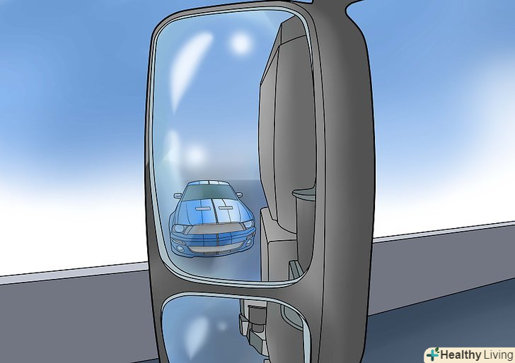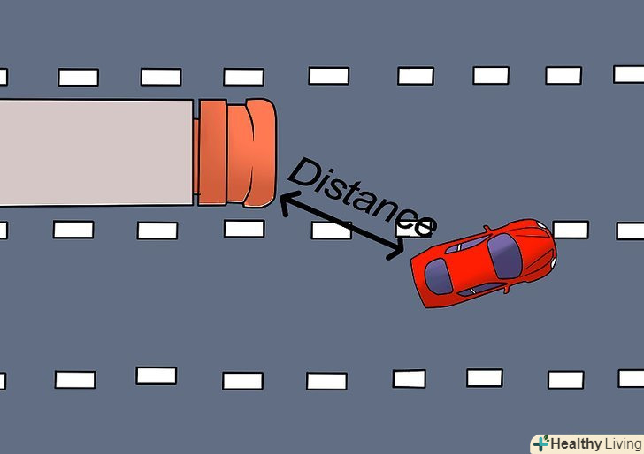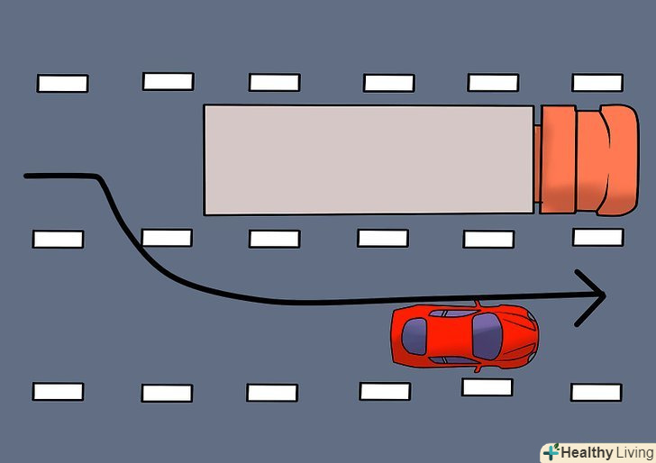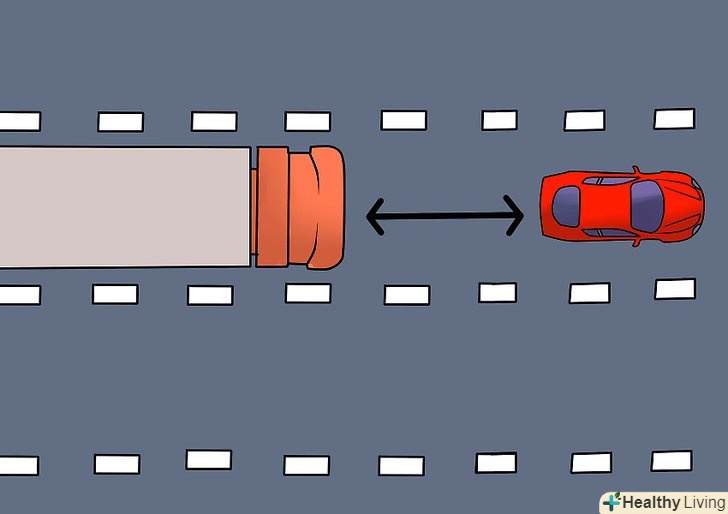 Не підрізайте вантажівку після обгону.водії вантажівок сидять високо, і капот частково закриває їм огляд спереду.[16] перед тим, як зайняти смугу, по якій рухається вантажівка, переконайтеся, що у внутрішньому дзеркалі заднього виду ви повністю бачите кабіну вантажівки (або обидві його передні фари).[17] для зупинки вантажівці потрібно вдвічі більше часу і місця, ніж легковому автомобілю.[18]- Не знижуйте швидкість після того, як обженете вантажівку. Ви все-ще можете перебувати в сліпій зоні водія. Але, навіть якщо водій вас помітить, він не зможе знизити швидкість так само швидко, як і ви. Після обгону продовжуйте прискорюватися, поки не відірветеся на відстань не менше 10 довжин автомобілів.[19]