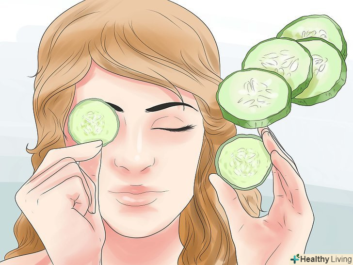 Спробуйте скибочки огірків.огірок має ряд цілющих властивостей, надаючи на шкіру відновлює і лікувальний ефект.[8] для застосування огірка як засіб по зменшенню темних кіл під очима добре охолодіть його в холодильнику, потім наріжте кружечками товщиною приблизно 1 см.ляжте, покладіть по кружечку огірка на кожне око. Полежте так хвилин 10-15, потім приберіть огірки.- Як варіант, вичавіть з огірка сік. Намочіть огірковим соком ватяні диски і притисніть їх до очей.[9]
