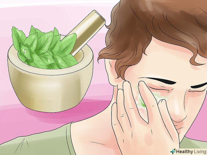Прикладіть листя м'яти.подрібніть кілька листочків м'яти до кашоподібного стану. Додайте сік половини лимона, перемішайте. Нанесіть суміш на область під очима. Залиште на 15 хвилин, потім змийте холодною водою. Щодня повторюйте процедуру двічі на день. [10]