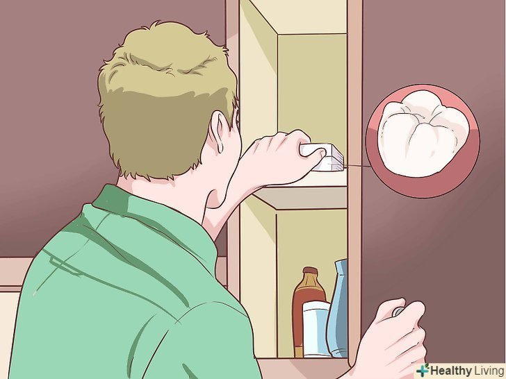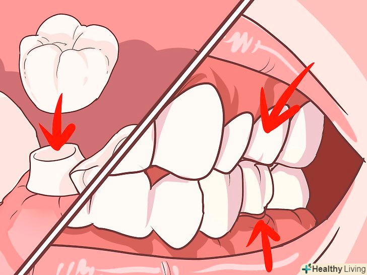 Витягніть корону з рота.обережно вийміть корону з рота, щоб не впустити або не проковтнути її. Якщо ви її вже проковтнули, вам ніщо не загрожує, але коронку необхідно буде замінити. [1]- Якщо ви втратили коронку, то можете накласти на поверхню зуба продається без рецепта зубний цемент (доступний у багатьох аптеках), щоб тимчасово запломбувати це місце, поки стоматолог не займеться його лікуванням.[2]