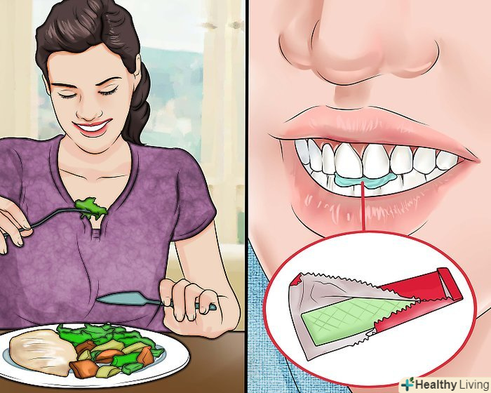 Скористайтеся "природними зубними щітками".З'їжте сире яблуко, селеру або моркву, щоб зімітувати ефект чищення зубів. Ці волокнисті продукти досить жорсткі, щоб ними можна було прибрати з зубів частинки їжі. Вони також збільшують вироблення слини, яка зберігає ваш рот вологим і видаляє бактерії.[15]