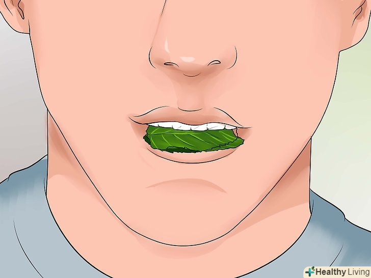 Пожуйте свіжий листочок м'яти.зберігайте у себе в сумочці невеликий пакетик зі свіжими листочками м'яти, щоб пожувати їх після прийому їжі. Якщо хочете, можете замінити м'яту петрушкою. Ефект, звичайно, довго не триватиме, але з їх допомогою можна досить швидко поліпшити запах з рота.[16]
