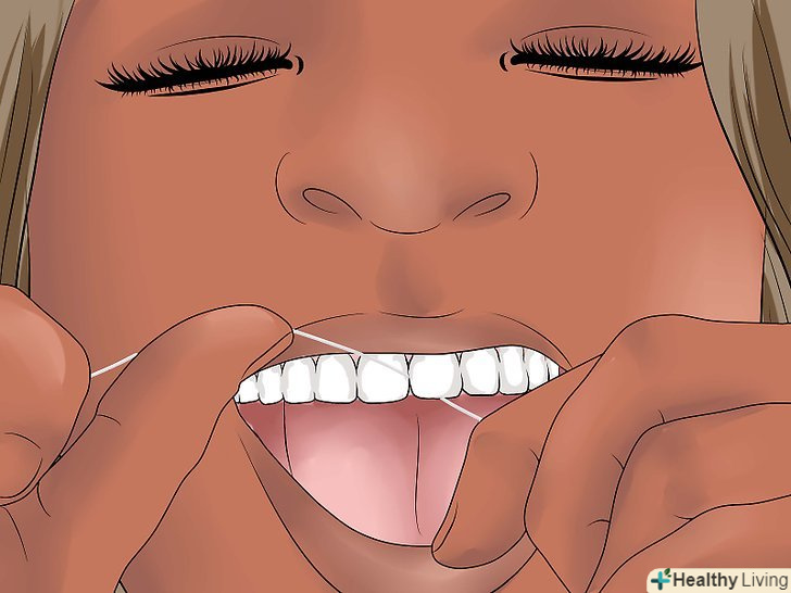 Почистіть зуби зубною ниткою.відріжте приблизно 40 см зубної нитки. Намотайте нитку на вказівний і середній палець лівої і правої руки, залишивши лише 3 см нитки. Вставте зубну нитку між зубів і обережними рухами зішкребіть зубний наліт. Проведіть ниткою від краю ясен до верхівки зуба. Чистіть кожен зуб, змінюючи положення зубної нитки.[2]