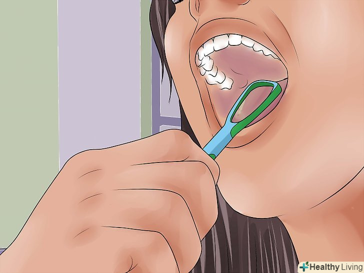 Почистіть мову.візьміть скребок для язика і покладіть його в задню частину язика, після чого злегка натисніть. Проведіть скребком вперед до кінчика язика. При необхідності повторіть. Дивіться, не засуньте скребок занадто далеко, щоб не вдавитися.[3]