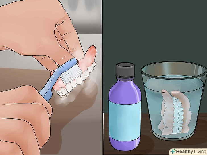 Почистіть зубні протези.візьміть щітку з м'якими щетинками і фторсодержащую зубну пасту, щоб видалити частинки їжі з зубних протезів. Почистіть їх так само, як звичайні зуби. Щоб видалити скупчення нальоту, замочіть протези на ніч в спеціальному розчині, після чого ретельно їх почистіть.[4]
