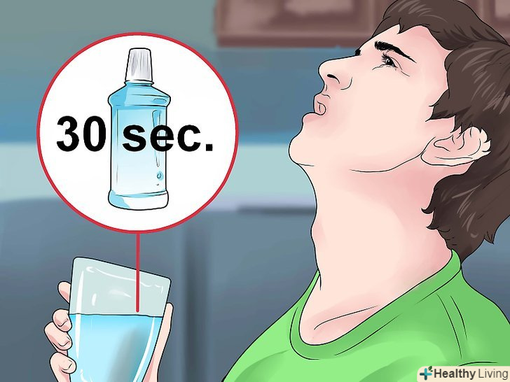 Прополощіть рот рідиною для полоскання рота.перш ніж взяти рідину для полоскання рота, почистіть зуби і прополощіть рот водою. Вилийте трохи рідини в ковпачок пляшечки з рідиною для полоскання рота. Кількість рідини буде залежати від вказівок виробника. Не розбавляйте рідину, якщо про це не сказано в інструкціях. Прополощіть рот рідиною для полоскання протягом 30 секунд. Потім виплюньте рідину в раковину і дивіться, не ковтайте її.