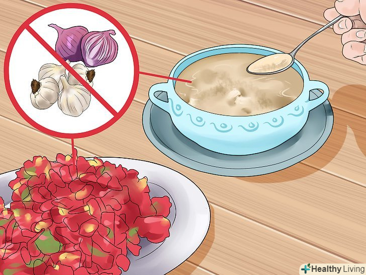 Уникайте їжі, яка видає різкий запах.зменшіть споживання цибулі та часнику. Запах цибулі і часнику залишається в роті на кілька годин. Він також проникає в кровотік, а це означає, що неприємний запах стане частиною повітря, що видихається вами.[7]
