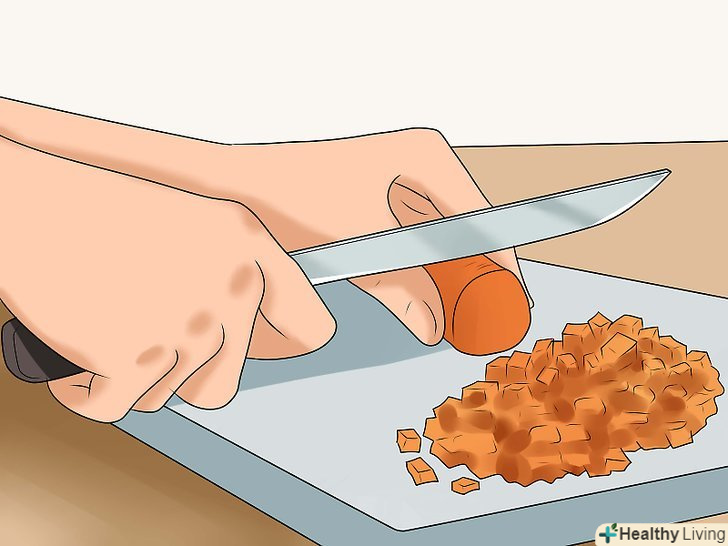 Вирізати тверду їжу.розріжте сирі овочі, фрукти та хрусткий хліб, щоб знизити тиск на брекети під час прийому їжі і щоб не пошкодити їх.[18]