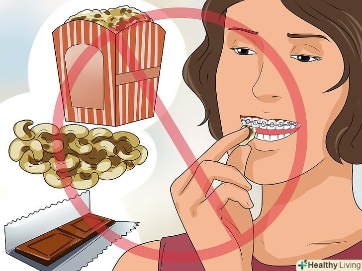 Не їжте дуже тверду або липку їжу.вона може пошкодити брекети і викликати карієс. Уникайте таких продуктів: [19]- Попкорн;