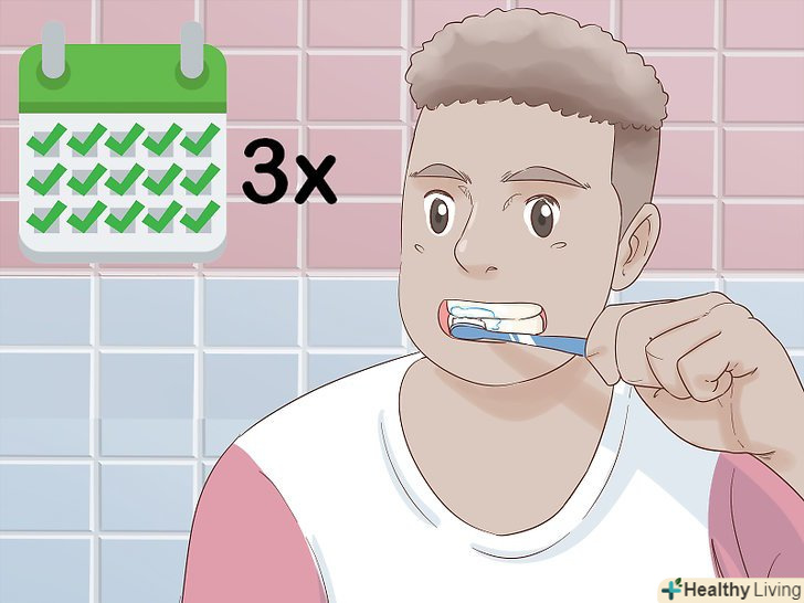 Чистіть зуби три рази на день.ретельно чистіть зуби вранці, після обіду і перед сном. Чистіть не тільки зуби, але і лінію ясен і самі ясна. Наспівуйте в розумі пісеньку» з днем Народження Тебе", щоб почистити зуби стільки, скільки потрібно. Регулярне і правильне чищення зубів зменшить кількість поганих бактерій і нальоту в роті. [12]- Якщо у вашої дитини псуються зуби, вам варто простежити за тим, як він чистить зуби.
