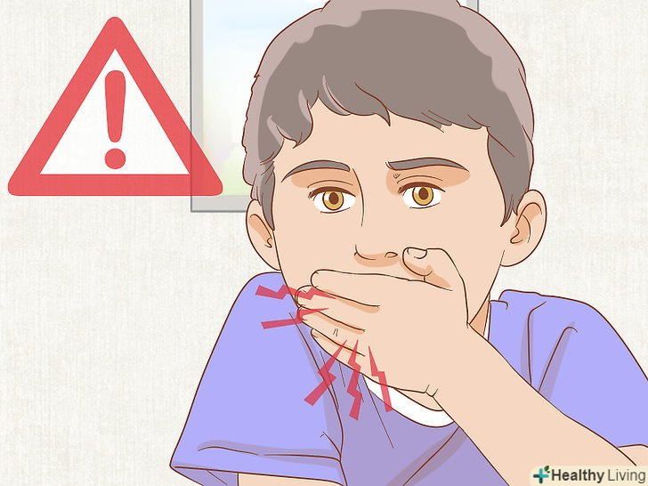 Посадіть потерпілого. якщо у вас (або у вашого близького) кровотеча, сядьте прямо і нахиліть голову вперед, кров буде витікати з рота, а не стікати вниз в шлунок. В іншому випадку кров, яку ви проковтнули, може викликати блювоту. Щоб цього не сталося, сядьте і нахиліть голову вперед.[4]